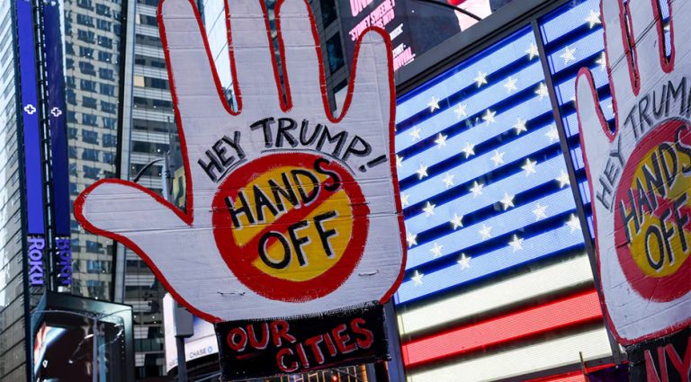 Cartel en forma de mano en la ciudad de Nueva York, “Trump, manos fuera de nuestras ciudades”. Uno de los detonantes de las manifestaciones No Kings ha sido el envío de tropas de la Guardia Nacional a las ciudades en contra de la voluntad de las autoridades y poblaciones locales. Foto: Reuters