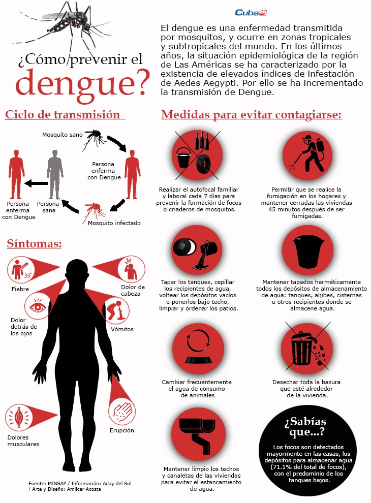 Infomed, el Portal de la Red de Salud de Cuba, recuerda que el dengue es una infección que no distingue grupos de edades, y puede ser desde resultar asintomática a cursar con síntomas que van desde fiebre moderada a una fiebre alta incapacitante, con dolor de cabeza intenso, dolor detrás de los ojos, dolor muscular y en las articulaciones, y erupción en la piel (rash). Precisan que la enfermedad también puede progresar a un dengue grave.