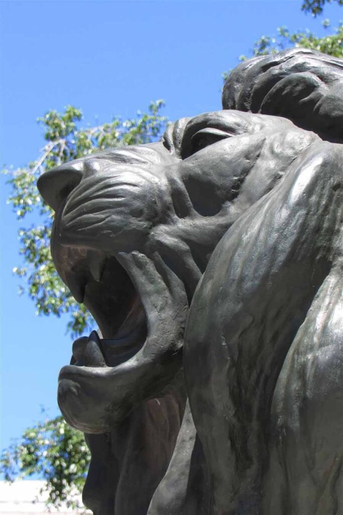 Siempre con mirada agresiva y un rugir que se podría escuchar con un poco de imaginación, estos leones constituyen escenario propicio para una foto familiar, o simplemente para enmarcarlos en hoteles del derredor como el Telégrafo o el Sevilla.